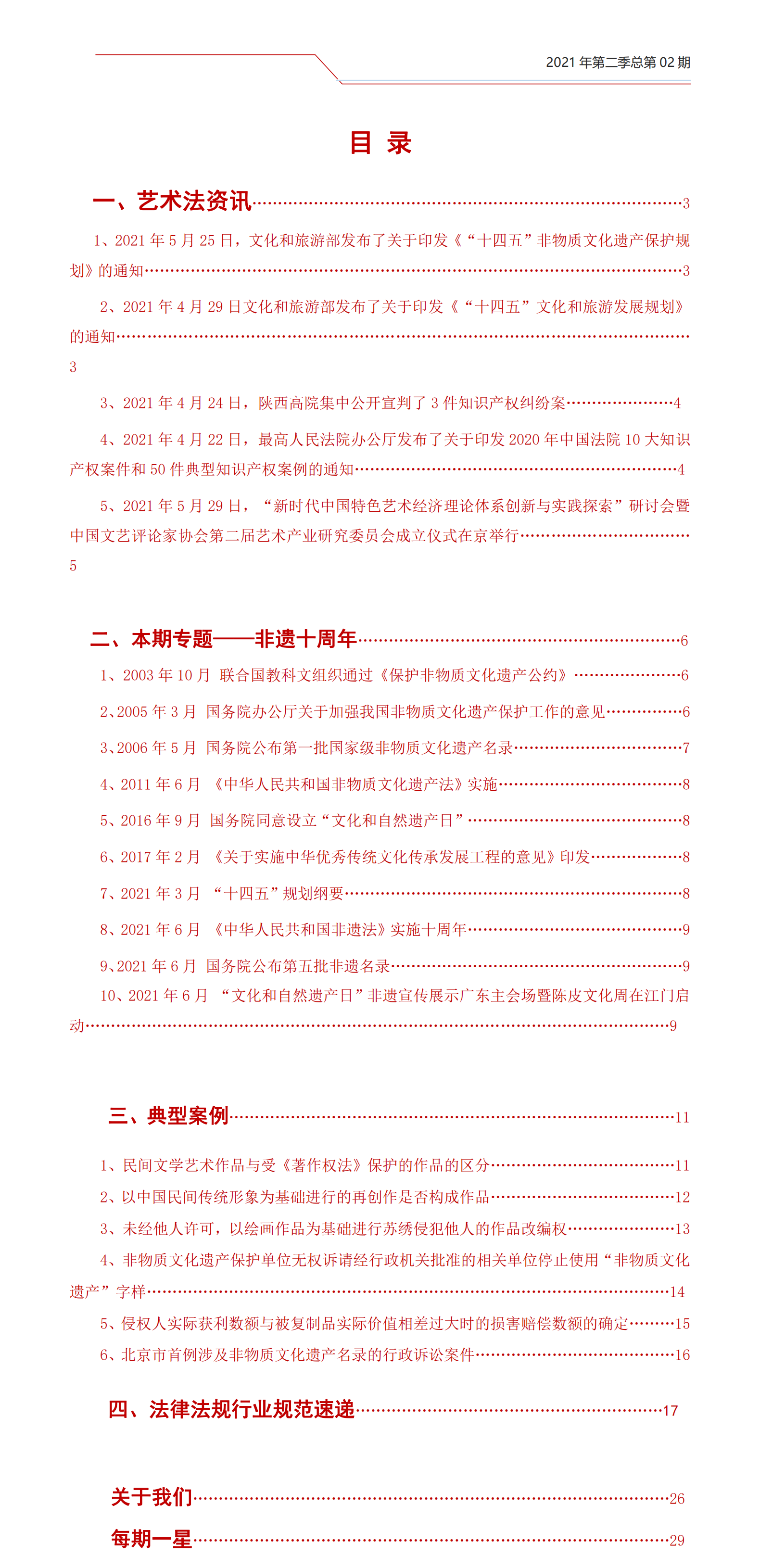 此外,本刊原有的专栏——“艺术法资讯”“典型案例”“法律法规行业规范速递”,也相应将“非遗”内容添加其中。尤其在“典型案例”栏目中,相关案例的梳理基本都围绕“非遗”展开: