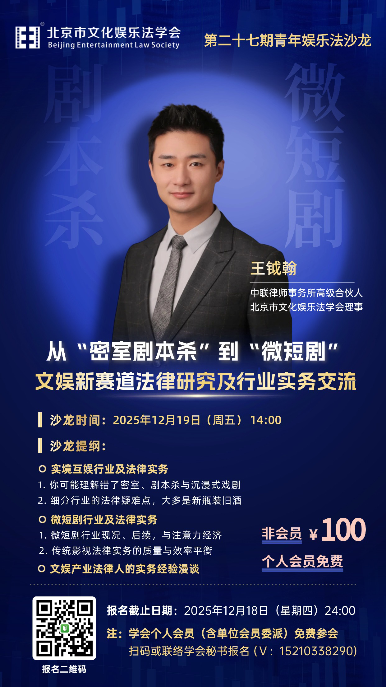12月19日第二十七期青年娱乐法沙龙报名通知丨从“密室剧本杀”到“微短剧”——文娱新赛道法律研究及行业实务交流